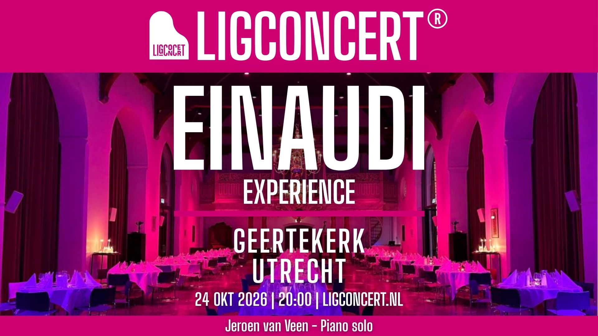 Dompel jezelf onder in de betoverende klanken van Ludovico Einaudi’s mooiste werken, gespeeld door niemand minder dan pianist Jeroen van Veen. In de intieme en serene setting van de Geertekerk in Utrecht – waar eeuwenoude historie en fantastische akoestiek samenvloeien – beleef je een Ligconcert® zoals geen ander.